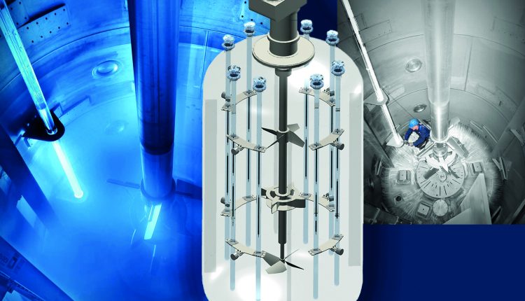 The light sources are mercury or LED lamps submerged into the reaction mass inside a quartz glass tube. The glass tubes pass through nozzles in the tank head, where they connect to the power supply and the cooling medium. They need a hermetic sealing and monitoring to ensure that the unexpected case of a glass breakage is immediately detected. Their support must avoid local stress, allow for thermal expansion and prevent from vibration initiated by the intense agitation. As the power of the UV-lamps ranges from 5 to 60 kW each, the lamps need to be cooled inside the quartz tubes, otherwise high surface temperatures could damage the products. Industrial reactors can be equipped with 4 to 20 of such quartz tubes.