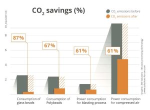 Following the commissioning of the new systems, measurable improvements in post-processing were quickly observed. The consumption of polybeads decreased by over 60% within the first year, as the blasting media is maintained far more efficiently in the circuit. This alone resulted in a CO₂ savings of approximately 1.6 metric tons. At the same time, the use of glass beads was nearly eliminated, virtually eliminating the known issues during component dyeing. Additionally, disposal costs were significantly reduced.