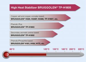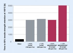 BRUGGOLEN TP-H1607 outperforms conventional copper salt based stabilizers. It extends mechanical property retention after heat aging to new limits.