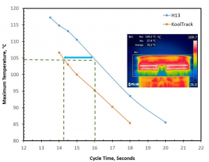 StackTeck began this pail mold development by benchmarking several different 5-gallon pail molds with thick rim features that presented a cooling challenge. Most of these reference parts typically run in the range of 17-18 seconds. For the standard pail design (see Fig. 1 above), two sets of collets were made using alternate materials H13 and KoolTrackTM steel alloy. With the H13 collets, a cycle time of 16.0 seconds was achieved. Using the KoolTrackTM collets there was a 1.8 second cycle time improvement and a final cycle time of 14.2 seconds for the standard pail – refer to chart below. In both cases, the ejection part temperature was measured by means of a thermal camera.